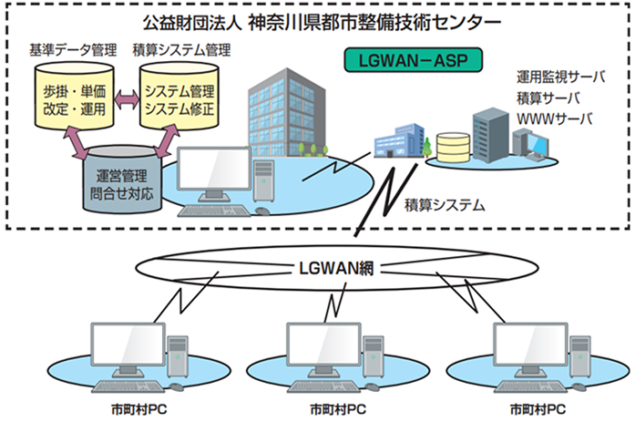 市町村等の職員が公共工事の発注に際し、最新の単価・歩掛情報を用いて的確かつ安全に工事費を算出できるよう、LGWAN(総合行政ネットワーク)回線で公共土木工事積算システムを提供しています。